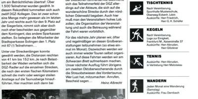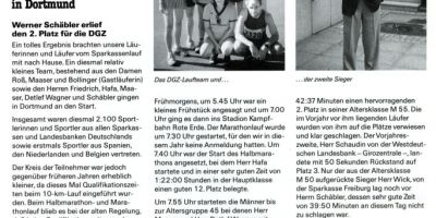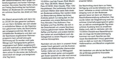 1996 gab es viel positives vom Sparkassenmarathon zu berichten. Zu beachten ist das Trainingsprogramm von Bettina Knabe (jetzt Kronemann) und das modische Leibchen. Außerdem ehrte Betriebssportvorstand Rainer Färber Herrn Dieter Friedrich für sein langjähriges Betriebssport-Engagement.